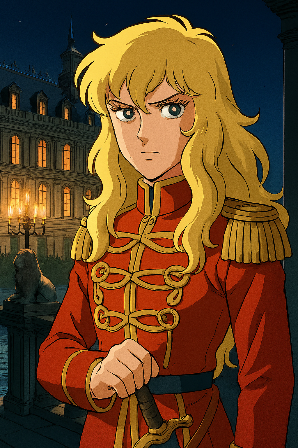 Oscar François de Jarjayes, indomito comandante, valorosa spadaccina che, spada sguainata stretta nella mano destra, si lancia sempre all’attacco contro ogni nemico, in nome della Francia e della regina alla quale é fedele.