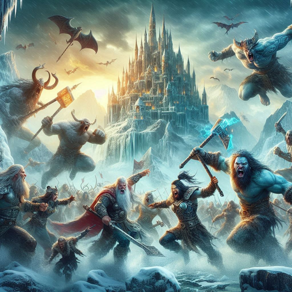 Di fronte a loro c’era però un’armata ben più numerosa e terribile: i Giganti di Ghiaccio, discendenti di Ymir, erano come montagne in movimento e il gelo che li circondava spezzava la terra congelando persino l’aria. I Giganti di Fuoco, guidati da Surtr, sembravano invece torce viventi: ogni loro passo incendiava il suolo, e le loro spade erano lingue di lava. Gli Elfi Oscuri, deformati dalla vendetta e dalla solitudine, si muovevano come ombre, con lame avvelenate e occhi che non riflettevano luce. Accanto a loro erano schierate le orde dei Troll, brutali e primitivi guerrieri armati di asce e mazze ferrate.